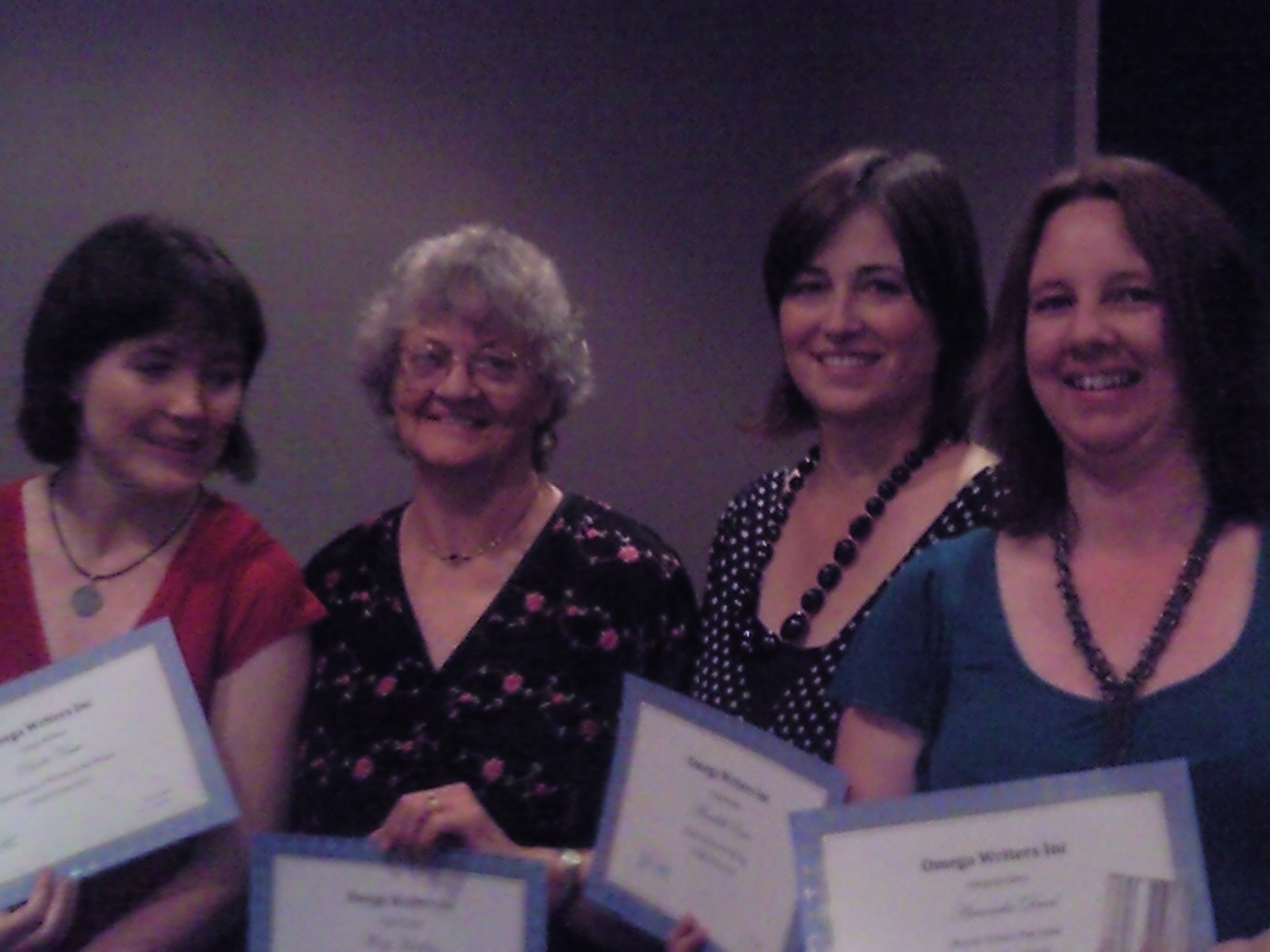 The other finalists for the fiction prize are wonderful writers, and I salute them. They are, left to right: Paula Vince, Mary Hawkins, and Meredith Resce. (That’s me on the right.) These women are an inspiration to me and I have and will continue to learn from them.