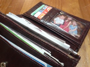 People keep all sorts of things inside their purses and wallets, but I don’t think I really have anything out of the ordinary. I have receipts, a few coins, frequent shoppers’ cards, credit cards, ID cards of various kinds, membership cards and a few business cards. Nothing to really write home about, indeed nothing stellar to even blog about.