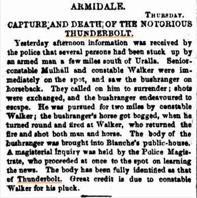 One of Australia’s most notorious bushrangers, Captain Thunderbolt is dead. Shot down by Constable Alexander Binney Walker near Uralla after a long chase.