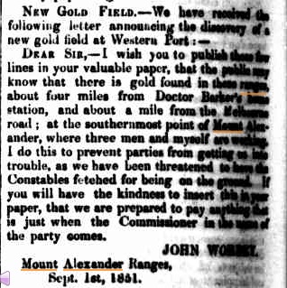 At first it was kept quiet. I guess Mr Barker didn’t want hordes of people rushing his land! Yet, John Worley sent a letter to the editor of the Argus in September, announcing the find . By October hundreds of diggers started to arrive and by December there were over 20,000 men working the fields at Mt Alexander (Castlemaine).